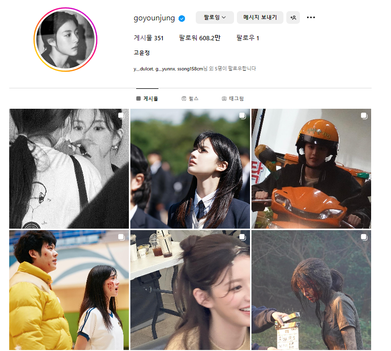 배우 고윤정의 인스타그램 팔로워수는 600만명이 넘었습니다. 과거 600만명이었는데 현재는 616.3만명으로 늘어났습니다.