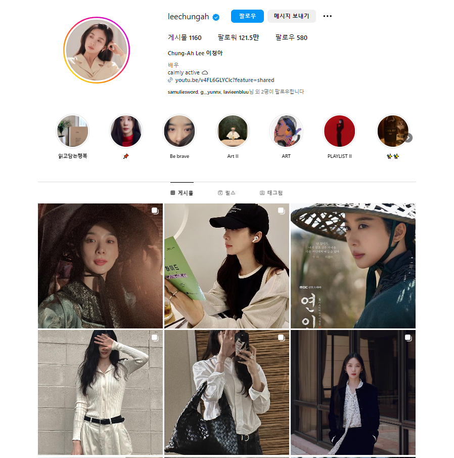 배우 이청아의 인스타그램 팔로워 수는 121.5만 명입니다.