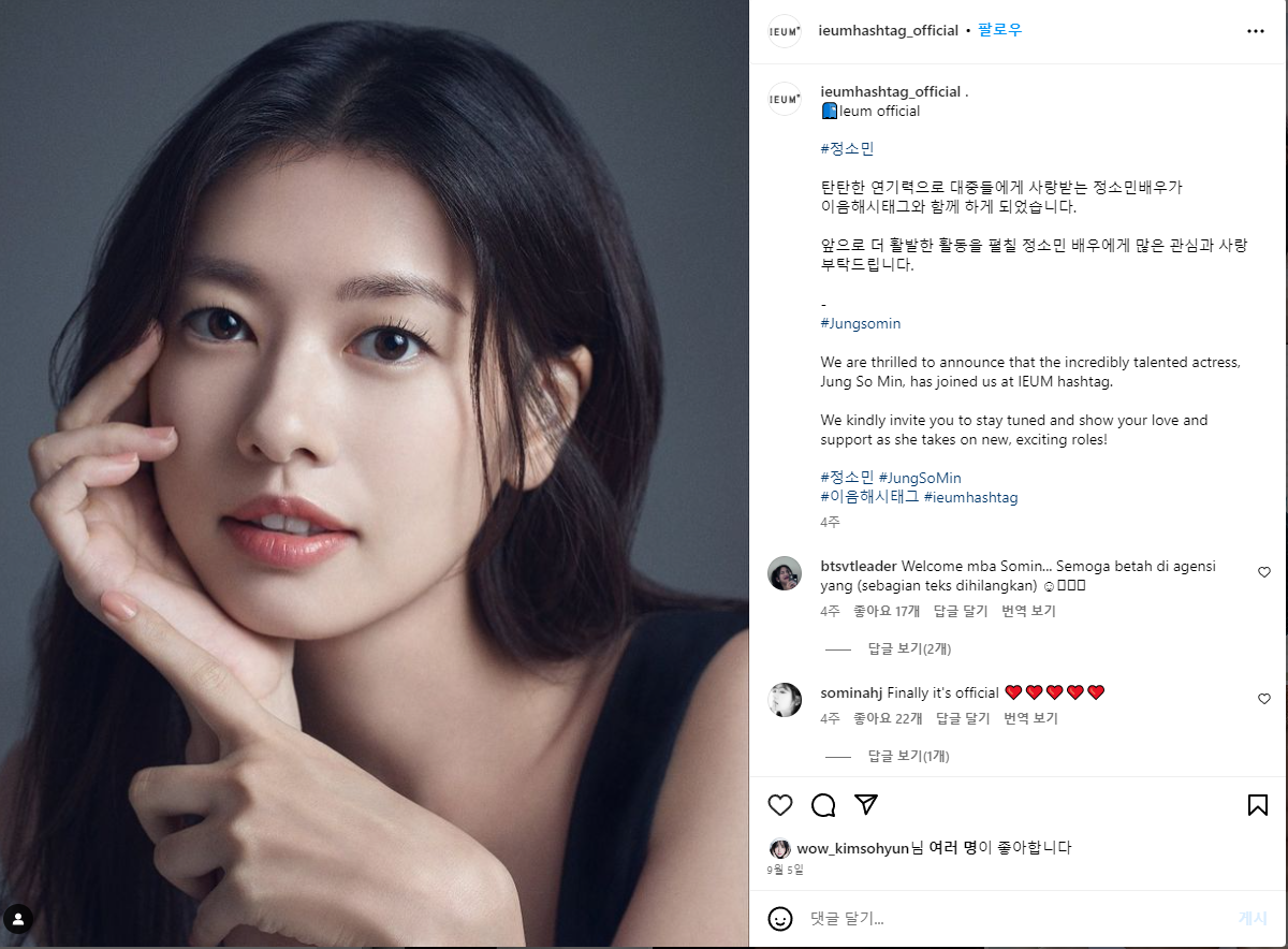 정소민 배우의 소속사는 IEUM입니다.(전지현, 서지혜, 김소현, 김설현 등 소속)